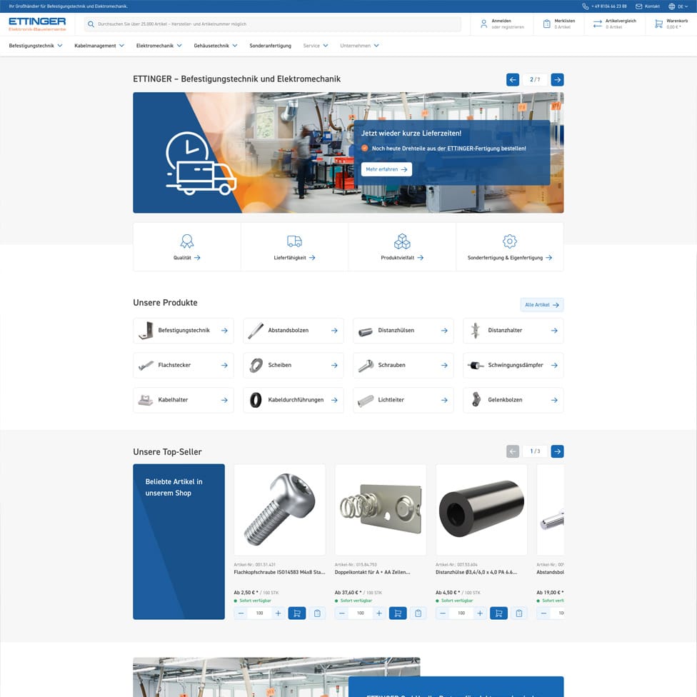 ETTINGER GmbH Relaunch des B2B Shops auf Basis von Shopware 6 Kunde: ETTINGER GmbHBranche: Großhändler für Befestigungstechnik und ElektromechanikWeb-Adresse: www.ettinger.deTechnologien: Shopware GoLive: Oktober 2024 ettinger.de Key Facts Projekt Shopware 6 B2B-Onlineshop Relaunch Von der Idee bis zum Go-Live: Komplettumsetzung Von der Konzeption über das Design bis hin zur technischen Realisierung und dem Go-Live im Oktober 2024: Die gesamte Entwicklung […]